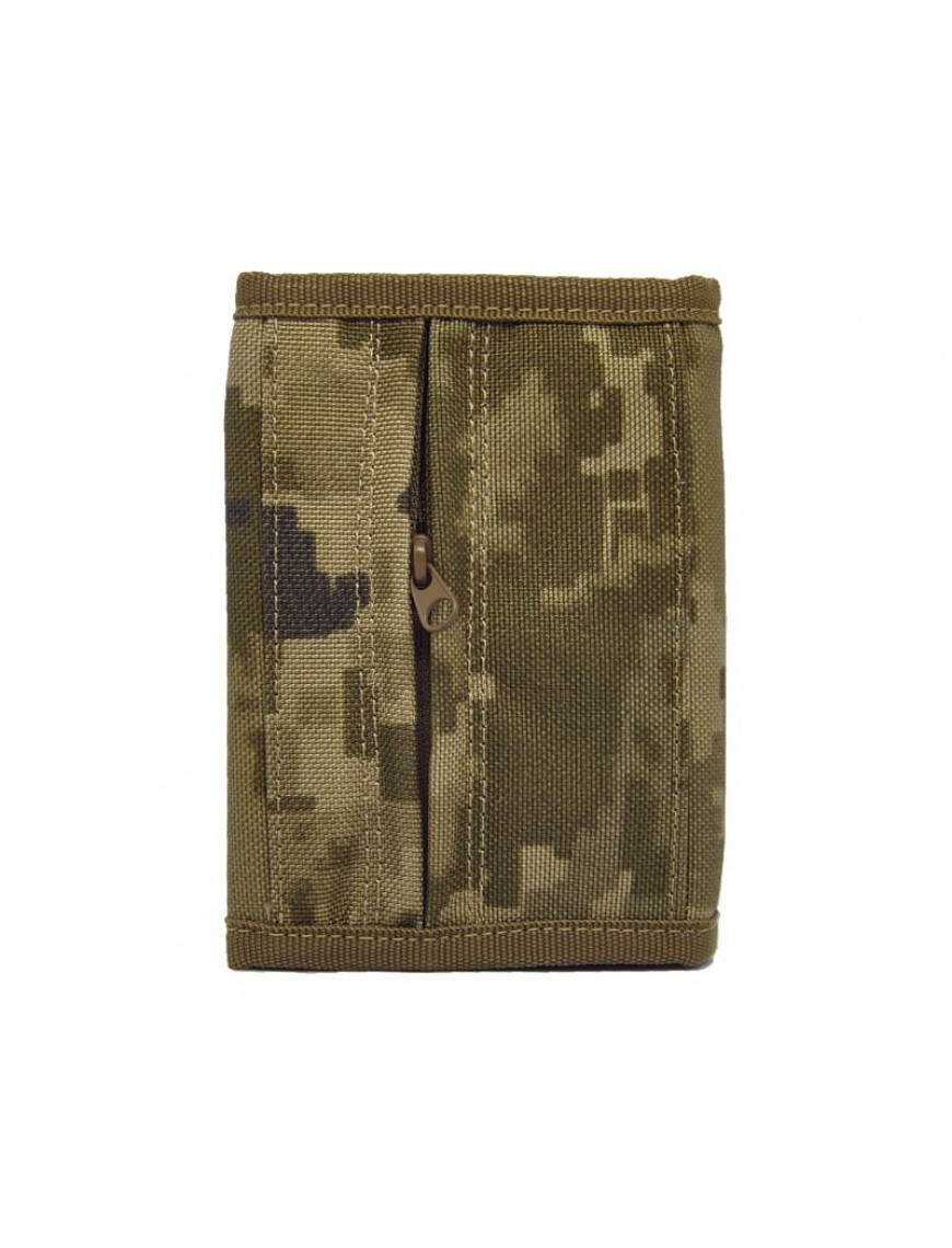 Вільно поміщається в кишеню джинсів або тактичних штанів. В ньому передбачені відділення під права, кредитки, різні дрібниці, відділення на металеві монети та відділення на паперові купюри що додатково закривається на блискавку. Гаманець застібається на якісну липучку Velkro. Модель виготовлена в стилі мілітарі.