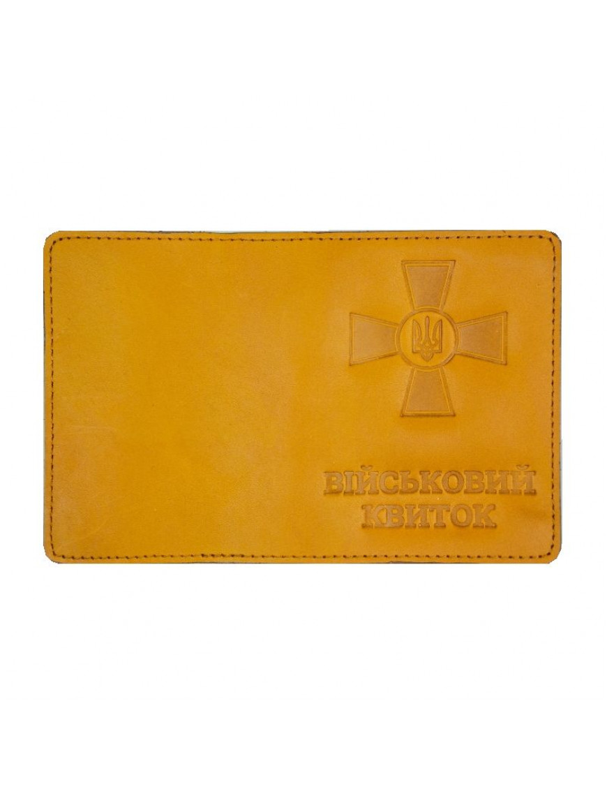 Жовта шкіряна обкладинка для військового квитка — яскравий і водночас практичний аксесуар для надійного зберігання важливого документа. Виготовлена з натуральної шкіри високої якості, вона поєднує міцність та стильний вигляд. На лицьовій стороні виконане тиснення з написом «Військовий квиток», а також розташований хрест ЗСУ з тризубом, що підкреслює патріотичний характер виробу.
