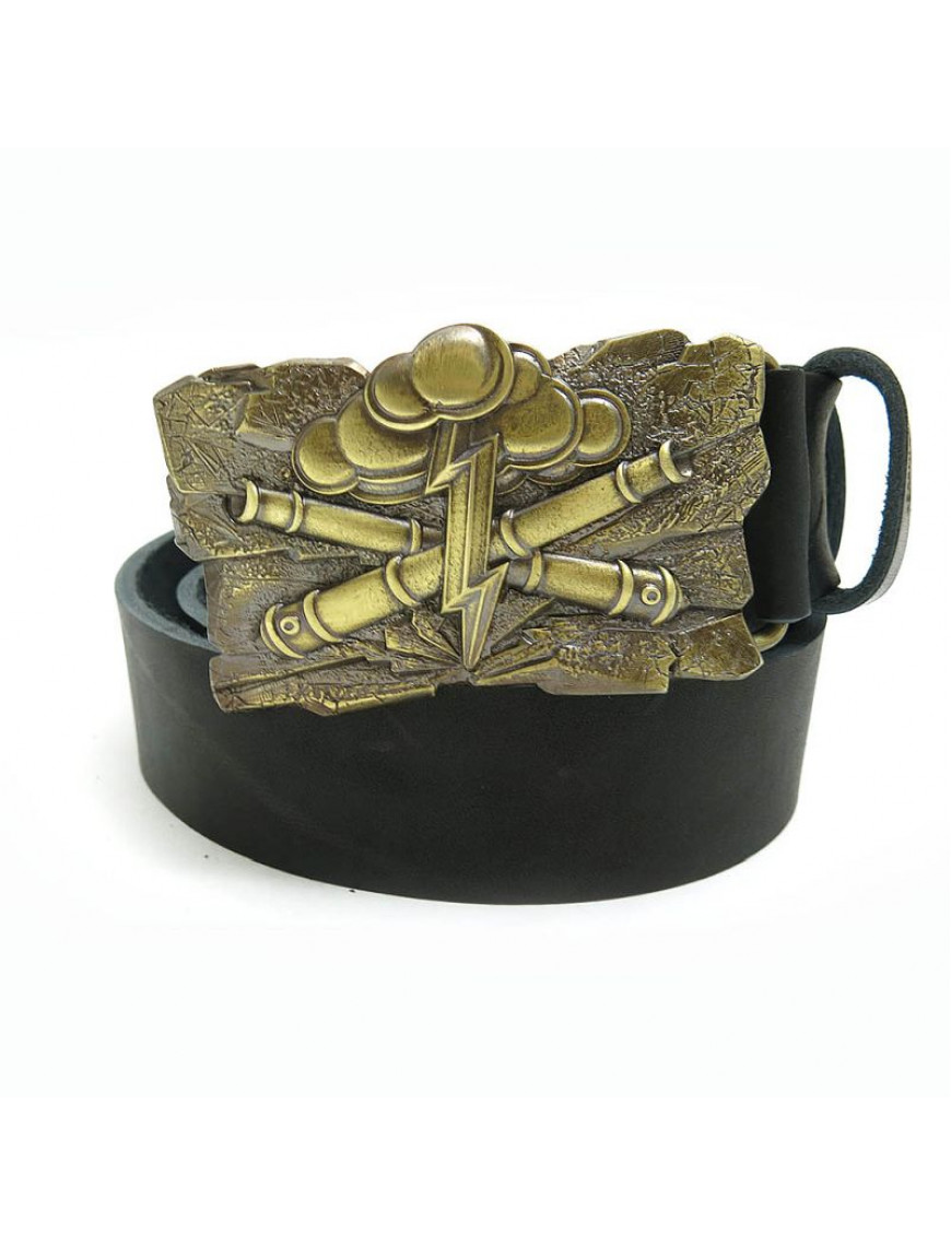 За основу пряжки взято знак ракетних військ і артилерії України. Емблема артилерії є однією з найдавніших емблем роду військ. Схрещені гарматні стволи використовуються з 18 ст. Українське військо офіційно отримало емблему гармашів у 1917 році, за часів Генерального секретаря військових справ УНР Симона Петлюри.