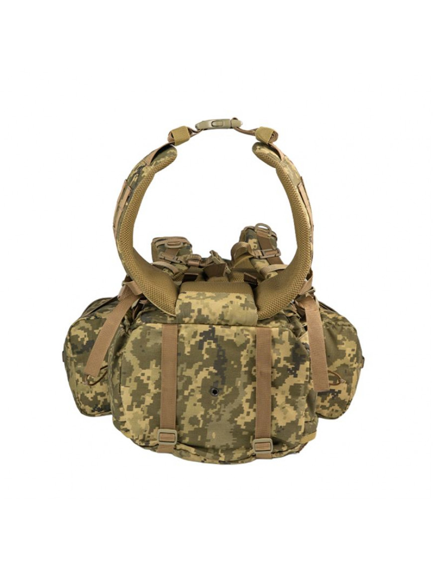 Модель оснащена двома оновленими знімними бічними підсумками об’ємом по 5,25 л кожен, сумісними з MOLLE/PALS, що дозволяє гнучко налаштовувати конфігурацію спорядження. Верхній доступ із двома рівнями компресійних шнурів, регульована висота спинки з оновленою системою TBA, нагрудний ремінь та перероблений пояс із MOLLE/PALS забезпечують стабільність і комфорт при повному завантаженні. Талійний ремінь - знімний.