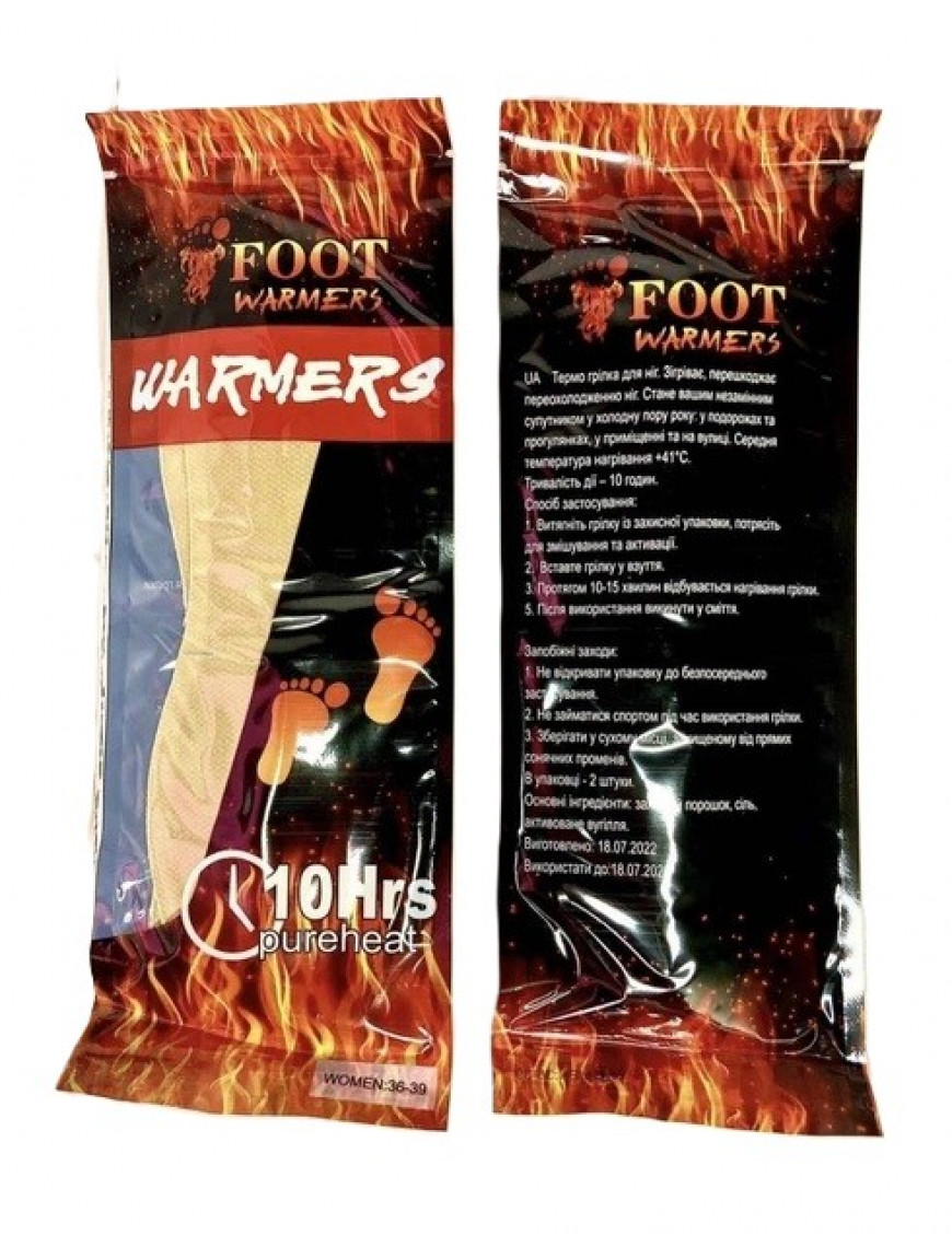 Тонка та ергономічна форма дозволяє комфортно розмістити їх у будь-якому взутті поверх основної устілки або шкарпетки, не створюючи зайвого тиску на стопу. Використання натуральних компонентів гарантує екологічність та безпеку. Foot Warmers — це незамінний елемент індивідуального захисту від переохолодження, який дозволяє зберігати працездатність та комфорт навіть при екстремально низьких температурах.